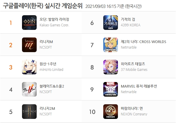 8위 자리를 두고 37게임즈 '히어로즈 테일즈'와 넷마블 '마블 퓨처 레볼루션'이 경쟁하고 있다. 10위는 넥슨 '바람의 나라 연'이 차지했고 넷마블 '세븐나이츠2', 릴리스 '라이즈 오브 킹덤즈', 웹젠 'R2M' 등이 그 뒤를 따랐다.