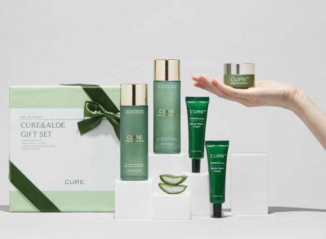 김정문알로에의 2021 큐어&알로에 기프트 세트는 큐어 인텐시브 2x 크림(30g), 큐어 하이드라 수딩 토너, 큐어 하이드라 수딩 에멀젼, 큐어 인텐시브 배리어 릴리프 크림(20g/2개) 등 알로에를 함유한 대표 제품으로 구성됐다.