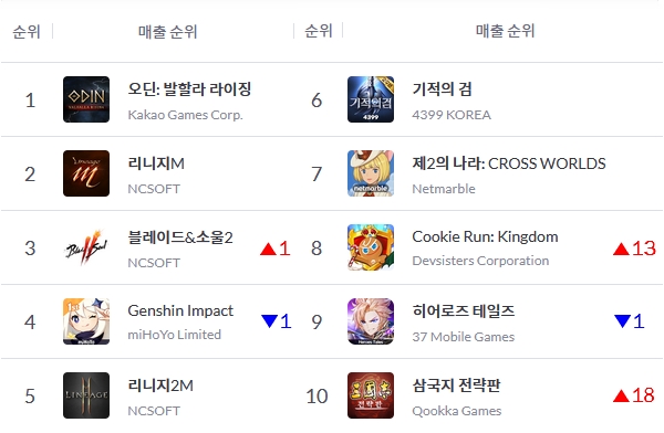 NC '리니지2M'과 4399게임즈 '기적의 검', 넷마블 '제2의 나라: Cross Worlds'는 꾸준한 성적을 기록했다. 데브시스터즈 '쿠키런 킹덤'은 일본 진출을 본격화한 가운데 지난 2일 '타올라라! 열정의 홀리베리 왕국' 업데이트를 단행, 6일 톱10에 복귀한 데 이어 이날 8위까지 치고 올라왔다.