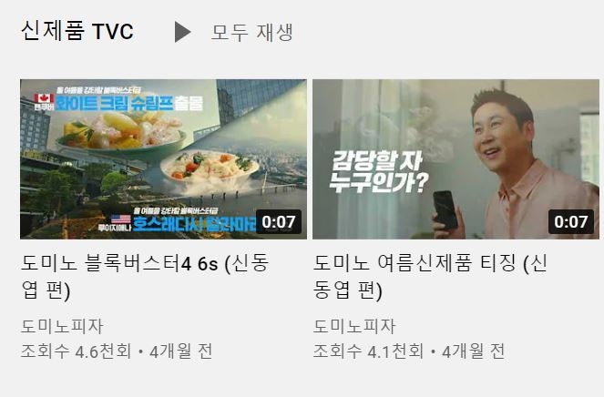 지난 6월 도미노피자 공식 유튜브 채널에 올라온 ‘여름 신제품 티징(미리보기)’ 영상도 현재 신동엽 편만 남아있다.