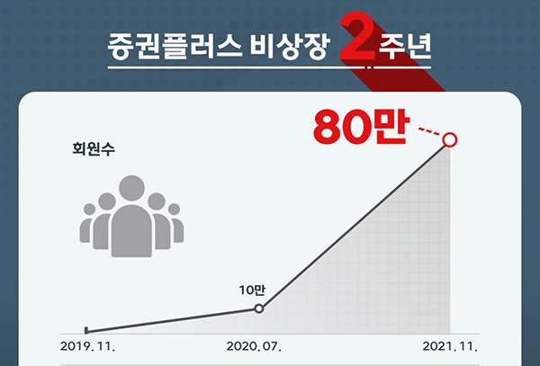 두나무(대표 이석우)는 '증권플러스 비상장' 출시 2주년을 맞아 그간의 성과를 인포그래픽으로 공개했다고 15일 밝혔다.국내 비상장 주식 시장에서 증권플러스 비상장이 세운 기록은 처음이자 유일이다. 지난해 7월 회원 수 10만 명을 달성한 이후 11월 현재 회원 수 80만 명 이상을 보유하고 있다.