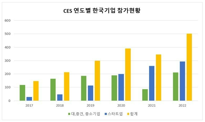 CES 2022 한국 참가기업수 가운데 대·중견·중소기업은 2017년도 118개에서 2022년 210개사로 77%의 증가를 보이고 있으며, 스타트업은 같은 기간 28개사에서 292개사로 약 10배가 증가했다. 이는 산업통상자원부 코트라(KOTRA), 중소벤처기업부 창업진흥원, 서울시 등 지자체,창조경제혁신센터, 대학교 산학협력단 등에서 스타트업 해외 진출을 적극적으로 지원한 결과다.