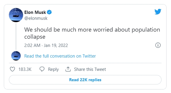 그는 현재 출산율이 빠르게 감소하고 있는 것이 인류 문명이 직면한 가장 큰 위험에 속한다는 우려를 최근에도 표명한 바 있다. 머스크는 지난 2020년 “이론적으로는 2050년까지 100만 인구의 식민지를 건설하는 것이 가능하다”고 밝힌 이후 화성 식민지 건설을 궁극적인 목표로 한 화상 탐사 계획을 추진 중이다.