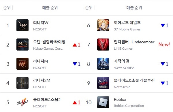 엔씨소프트(NC) '리니지W'가 꾸준히 1위를 지키는 가운데 '리니지M'과 카카오게임즈 '오딘: 발할라 라이징'은 한 주 동안 2위를 번갈아 차지하며 자리다툼을 벌이고 있다.