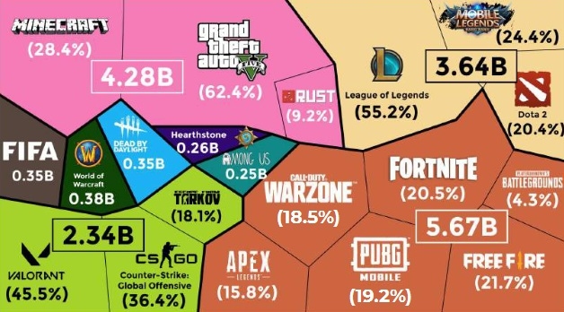 이미지 확대보기개인방송에서 가장 인기있는 게임 장르는 배틀로얄 슈팅 게임이다. 가레나 '프리 파이어', 크래프톤 '펍지: 배틀그라운드', 액티비전 '콜 오브 듀티: 워존', EA '에이펙스 레전드' 등이 포함된다.