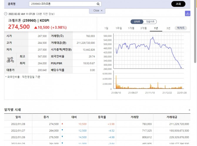 이미지 확대보기3일 한국거래소에 따르면 코스피 유가증권시장에서 크래프톤[259960] 주가는 2021년 46만원에서 1월말 27만4500원으로 한 달 동안에만 무려 40.33% 하락했다. 크래프톤이 이 기간 코스피 주가 하락률 단연 1위다. 코스피의 1월 월간 평균 하락률 10.56%의 4배가량 떨어졌다. 공모가 49만8천원과 비교하면 무려 44.88% 하락했다. 2월 10일에 크래프톤 총 발행주식의 31.66%에 해당하는 1천550만주가 또 의무보유에서 해제된다. 보호예수 물량이 한꺼번에 시장에 쏟아지면 주가가 더 내려갈 수 있다. 크래프톤의 주가 급락은 2021년 10월 출시한 신작 게임 '배틀그라운드: 뉴스테이트'(이하 '뉴스테이트')의 부진때문으로 보인다. 증권사들은 '뉴스테이트' 성과 부진 등을 이유로 크래프톤의 작년 4분기 실적이 전망치를 밑돌 것으로 예상하면서 크래프톤 목표 주가를 잇달아 하향 조정했다. NH투자증권[005940](70만원→57만원), 유진투자증권[001200](68만원→52만원), 삼성증권[016360](61만원→45만원), 메리츠증권[008560](72만원→68만원), 현대차증권[001500](66만원→60만원) 등 이다.