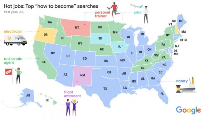 세계 최대 검색엔진 구글이 지난해 1월부터 지난달 1월까지 1년 사이에 미국인들이 구글에서 새로 구하고 싶은 일자리와 관련해 구글에서 검색한 결과를 분석한 결과다.