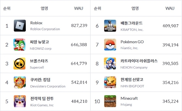 이미지 확대보기로블록스 코퍼레이션 '로블록스'는 82만명 이상의 WAU가 몰려 1위를 차지했다. 슈퍼셀 '브롤스타즈', 라이엇 게임즈 LOL(리그 오브 레전드) 모드 '전략적 팀 전투', 나이언틱 '포켓몬 고', 마이크로소프트 산하 모장 스튜디오 '마인크래프트' 등이 순위권에 포함됐다.