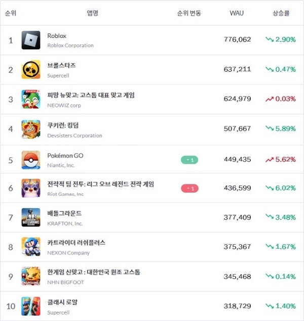 로블록스 코퍼레이션 '로블록스', 슈퍼셀 '브롤스타즈', 네오위즈 '피망 뉴맞고', 데브시스터즈 '쿠키런: 킹덤' 등은 한 주 동안 톱5 자리를 그대로 지켰다.