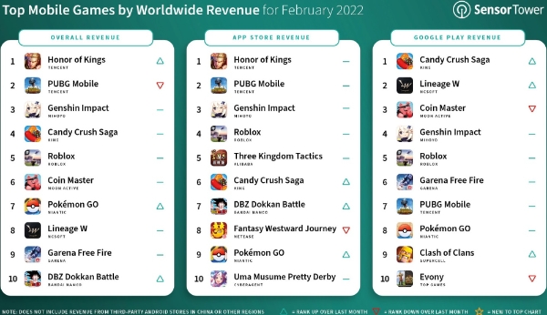 미호요 '원신', 킹 '캔디 크러쉬 사가', 로블록스 코퍼레이션 '로블록스' 등은 지난 1월에 이어 두 달 연속 톱5 자리를 사수했다.