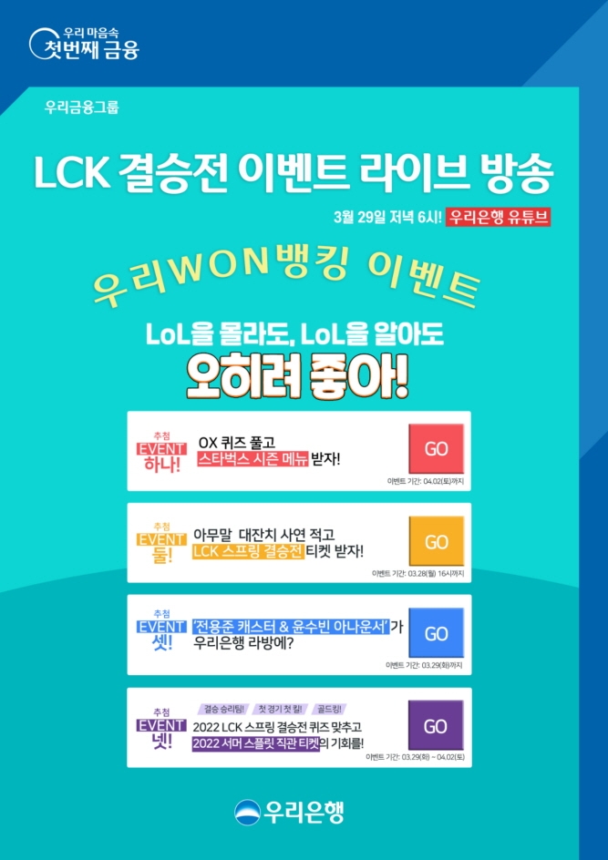 또한 우리은행은 LCK 결승전을 더 흥미롭게 즐길 수 있는 ‘롤을 몰라도! 롤은 알아도! 오히려 좋아!’ 이벤트도 진행한다.