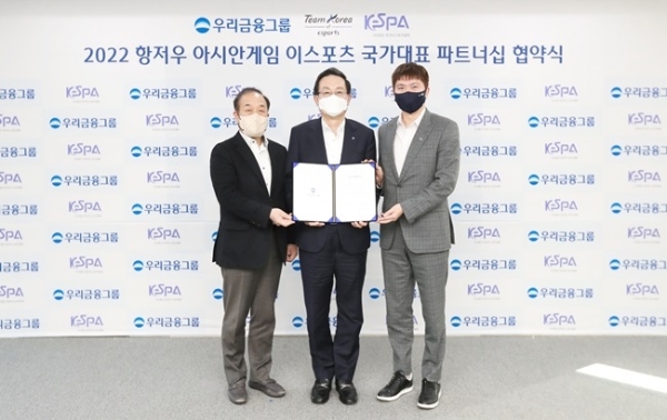 이미지 확대보기양 기관은 서울 중구 우리금융그룹 본사서 28일 협약식을 진행했다. 이번 협약식을 통해 우리금융그룹은 아시안게임 e스포츠 국가대표팀 첫 후원사이자 타이틀 후원사로 정해졌다.