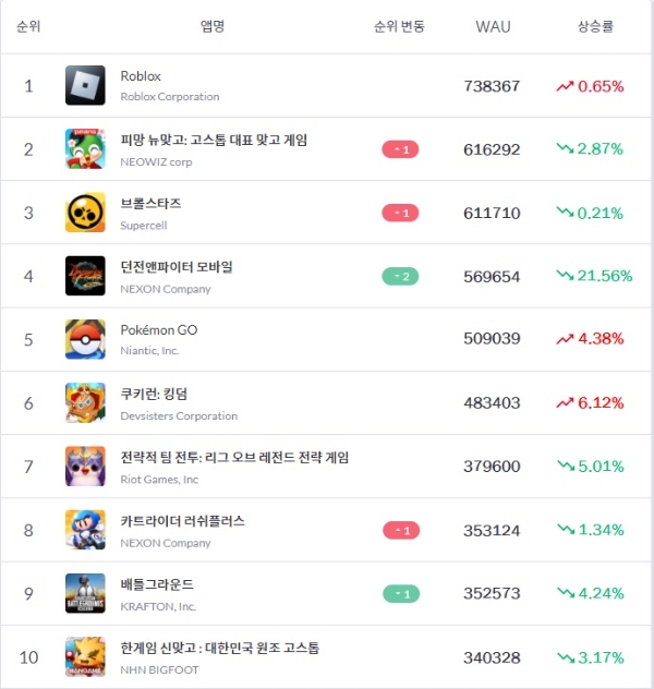 이미지 확대보기앱 통계 분석 플랫폼 모바일인덱스이 6일 발표한 3월 5주차(3월 28일~4월 3일) 자료에 따르면 '던파 모바일'의 WAU는 56만9654명으로 전주대비 12만2802명 감소, 네오위즈 '피망 뉴맞고'와 슈퍼셀 '브롤스타즈' 등에 밀려났다.