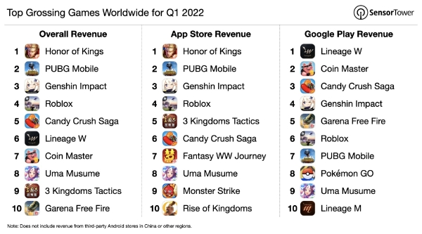 이미지 확대보기모바일 시장 분석업체 센서타워가 공개한 올 1분기 양대 마켓(구글 플레이스토어·애플 앱스토어) 매출 순위에 따르면 텐센트 '왕자영요', 크래프톤이 개발하고 텐센트가 서비스 중인 '배틀그라운드(배그) 모바일', 미호요 '원신'이 톱3를 휩쓸었다.