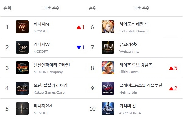 넥슨 '던전 앤 파이터 모바일', 카카오게임즈 '오딘: 발할라 라이징', NC '리니지2M', 37게임즈 '히어로즈 테일즈', 웹젠 '뮤오리진 3', 4399게임즈 '기적의 검' 등은 한 주 동안 제 자리를 지켰다.