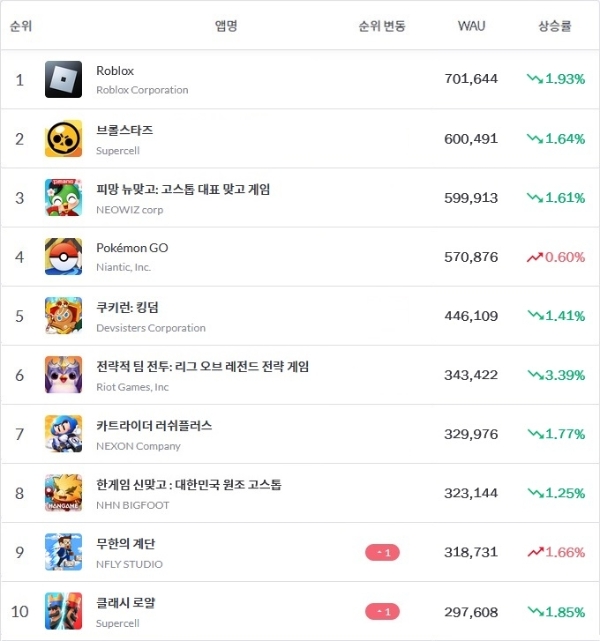 이미지 확대보기앱 통계 분석 플랫폼 모바일인덱스가 27일 발표한 구글 플레이스토어 4월 3주차(4월 18일~24일) 자료에 따르면 WAU 톱 10 게임 중 '포켓몬 고'와 '무한의 계단'만이 전주 대비 상승세를 보였으며 이 중 '무한의 계단'은 넥슨 '던전 앤 파이터(던파) 모바일'을 제치고 9위로 순위를 끌어 올렸다.