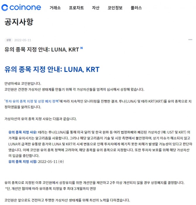 국내 4대 암호화폐 거래소 중 하나인 코인원(Coinone)이 급격한 가격 하락을 이유로 루나(Luna)의 거래를 중단했다. 코빗과 빗썸도 비슷한 우려를 표하며 코인에 '지정 투자 경고'를 발령했다.