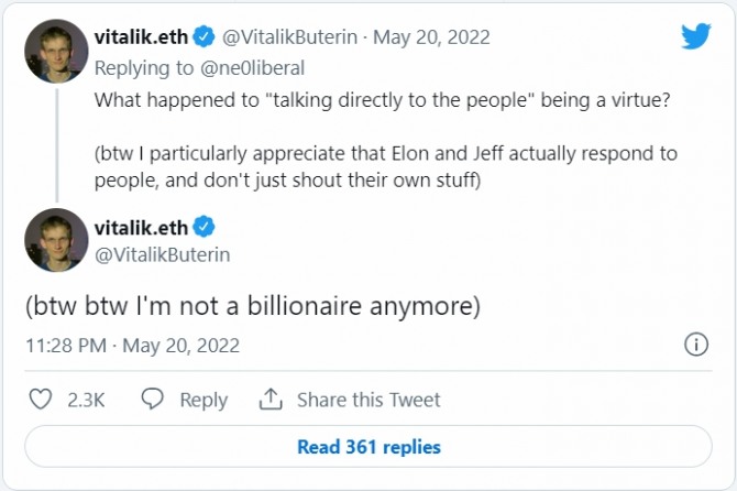 다른 억만장자들의 트윗에 대한 응답으로, 비탈릭은 가장 부유한 사람들의 리스트의 최상위에 있는 일론 머스크 테슬라 CEO와 아마존 창업자 제프 베조스를 언급했다.