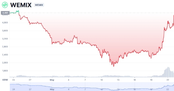 가상자산 통계 플랫폼 코인마켓캡에 따르면 위믹스는 지난 달 25일부터 꾸준히 하락세를 보였으나 이달 19일 2000원 초반대에서 반등을 시작, 지난 20일 자정 기준 2624원에서 23일 최대 4378원까지 66.8% 가량 폭등했다.