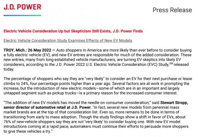 보고서는 지난해보다 전기차 구매를 심각하게 고려하는 미국의 소비자가 증가한 배경과 관련해 “여러 요인이 있지만 무엇보다 새로운 전기차들이 경쟁적으로 출시되고 있는 점, 특히 이제 막 시장이 형성되기 시작한 전기 픽업트럭들이 새롭게 이목을 끌면서 전기차에 대한 관심이 이전보다 커진 것으로 분석된다”고 밝혔다.