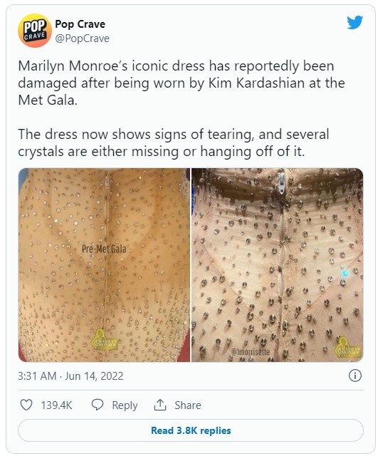그러나 13일 미국 연예 매체는 카다시안이 입었던 마릴린 먼로의 역사적인 드레스의 지퍼 부분이 상당히 늘어졌으며 드레스를 장식하는 크리스탈들이 떨어졌다는 소식을 보도했다. 매체는 2016년 찍은 먼로의 드레스의 모습과 카다시안이 착용한 후 찍은 드레스의 모습을 비교하는 사진을 게시했는데, 지퍼 부분의 천이 늘어나고 크리스탈 장식이 떨어진 모습이 보였다.