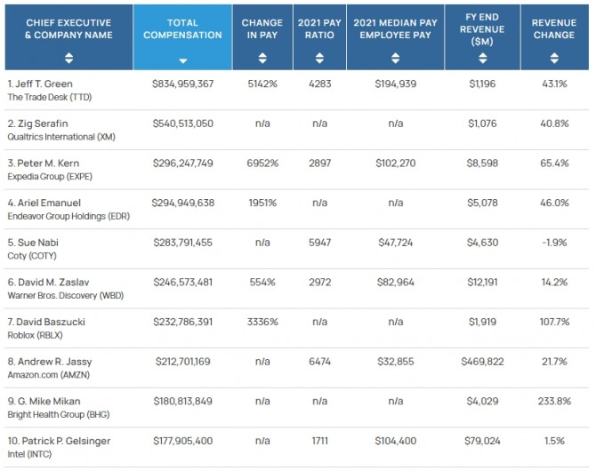 지난해 미국 주요기업 CEO 가운데 가장 많이 보수를 챙긴 사람은 글로벌 광고주 전용 플랫폼(DSP) 선도업체인 트레이드데스크의 제프 그린 CEO로 8억3500만달러(약 1조797억4000만원)를 챙겼다.