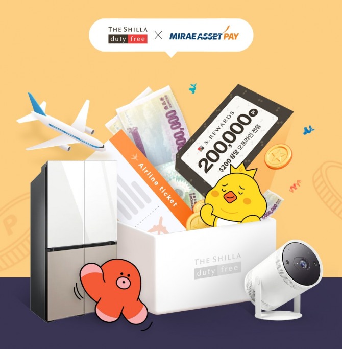 추첨 이벤트 경품은 모두투어 여행상품권 500만원권(1명), 삼성 비스포크 냉장고(1명), 삼성 프리스타일 빔 프로젝터(1명), 신라면세점 S리워즈 10만 포인트(10명)로 구성됐으며, 면세점 상품 구매 후 자동 응모 완료된다. 당첨 여부는 9월 16일에 미래에셋페이앱에서 당첨 여부를 확인할 수 있다.