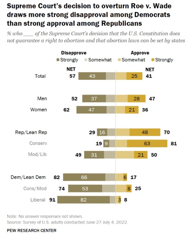 반면 연방대법원의 판결에 찬동한 응답자는 41%에 그친 것으로 나타났다고 퓨리서치센터는 설명했다. 이는 연방대법원의 판결이 내려진 지난달 24일 이후에 실시된 여론조사 결과다.