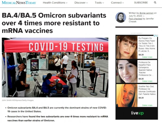 13일(현지시간) 의학 전문매체 메디컬뉴스투데이에 따르면 미 질병통제예방센터(CDC)는 이날 내놓은 연구 결과에서 BA.4와 BA.5의 경우 종래의 오미크론 변종에 비해 메신저 RNA(mRNA) 백신에 대한 저항성이 4배 이상 높은 것으로 파악됐다고 밝혔다.