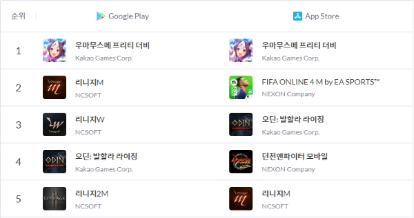 이미지 확대보기26일 오후 1시 기준 국내 양대 앱 마켓(구글 플레이스토어·애플 앱스토어) 매출 순위. 사진=모바일인덱스 사이게임즈가 개발하고 카카오게임즈가 국내 서비스를 맡은 '우마무스메: 프리티 더비'가 26일 오후 1시, 국내 양대 앱 마켓(구글 플레이스토어·애플 앱스토어) 매출 1위에 올랐다.