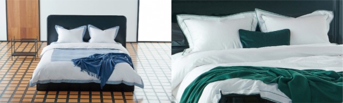 베네딕트 메트레는 베개 커버와 이불의 가장자리와 이불 가운데에 컬러 디테일을 더했다. 주요 소재로 은은한 광택감의 80수 새틴 면을 사용했다. 색상은 화이트 컬러에 차분함을 더해주는 블루그레이 조합과 모던함을 극대화하는 블랙·화이트 조합 두 가지다.