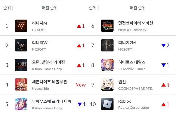 호요버스 '원신'은 지난 2일부터 '요이미야' 등을 복각하는 기원(뽑기) 업데이트가 적용된 후 톱10에 복귀했다. 로블록스 코퍼레이션 '로블록스'는 지난 달 27일, 28일 잠시 10위에 오른 데 이어 다시 한번 10위 자리를 차지했다.