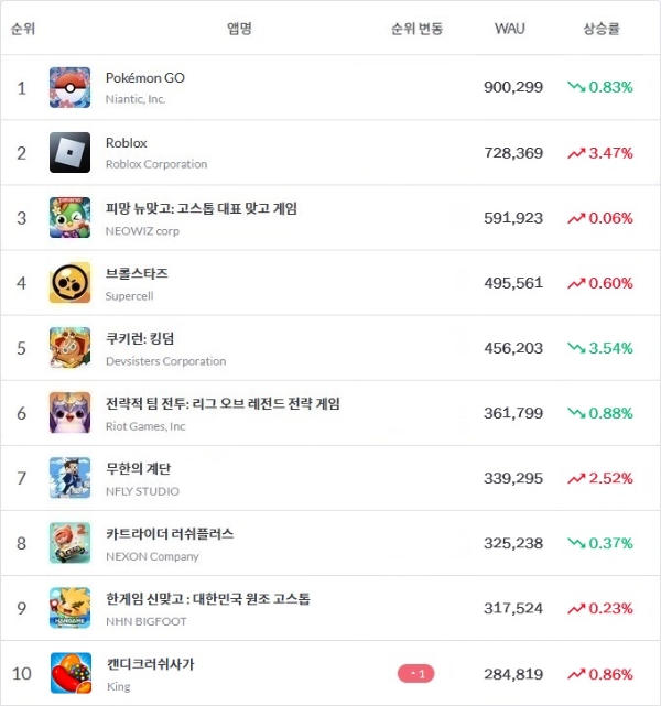WAU 상위 9개 게임 간 순위 변동이 없었던 가운데 나이언틱 '포켓몬 고'는 6월 4주차부터 2달 가까이 90만명대 WAU를 유지했다. 로블록스 코퍼레이션 '로블록스'와 엔플라이 스튜디오 '무한의 계단' 등이 이용자 수 면에서 소폭 상승세를 보였다.