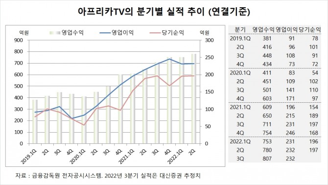 대신증권은 아프리카TV의 올해 3분기 영업수익(매출액)이 807억원, 영업이익이 232억원에 이를 것으로 내다보고 있습니다.