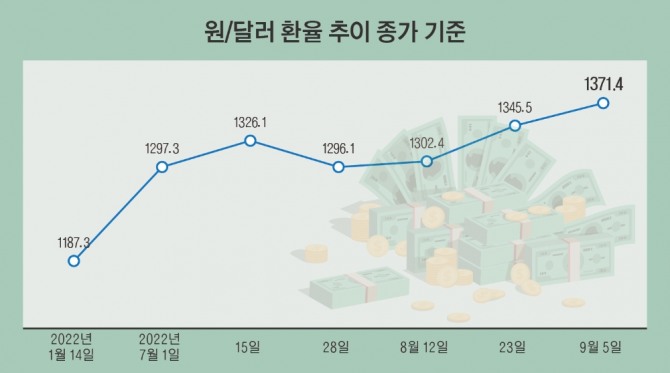 이미지 확대보기7일 서울 외환시장에서 지난 6일 기준 원·달러 환율은 달러당 1371.1원에 거래를 마치면서 고점을 높이고 있다. 원/달러 환율은 지난 5일 1370원을 돌파했는데, 이는 2009년 4월 1일(고가 기준 1392원) 이후 13년 5개월 만에 처음이었다. 지난 6월23일 1300원을 돌파한 환율은 지난달 23일까지 두달 만에 40원 올랐다. 지난주에도 1350원선과 1360원선을 연이어 넘으면서 원/달러 상단을 1400원선까지 열어놔야 한다는 우려가 나오고 있다.