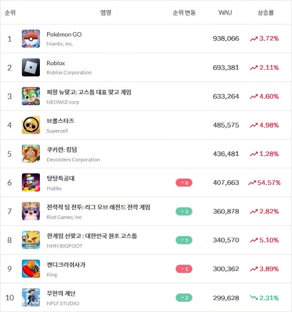 이미지 확대보기앱 통계 분석 플랫폼 모바일인덱스가 공개한 9월 1주차(8월 29일~9월 4일) 자료에 따르면 '탕탕특공대'는 이번주 WAU 40만명 이상을 기록, 전주 대비 6단계 높은 순위를 기록했다.