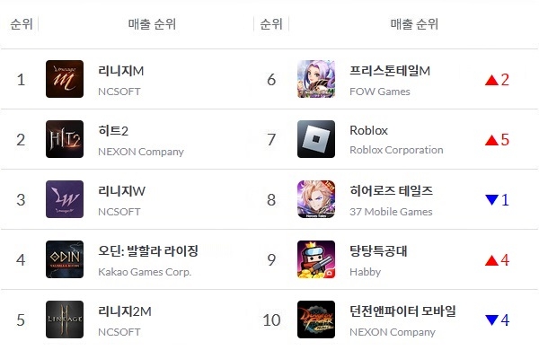 이미지 확대보기앱 통계 분석 플랫폼 모바일인덱스에 따르면 9월 2일 출시된 신작 '프리스톤테일M'은 6위, 8월 신작 '탕탕특공대'는 9위에 올랐다. 이들 외에도 출시 11년차 게임 플랫폼 '로블록스'가 7위에 올랐다.