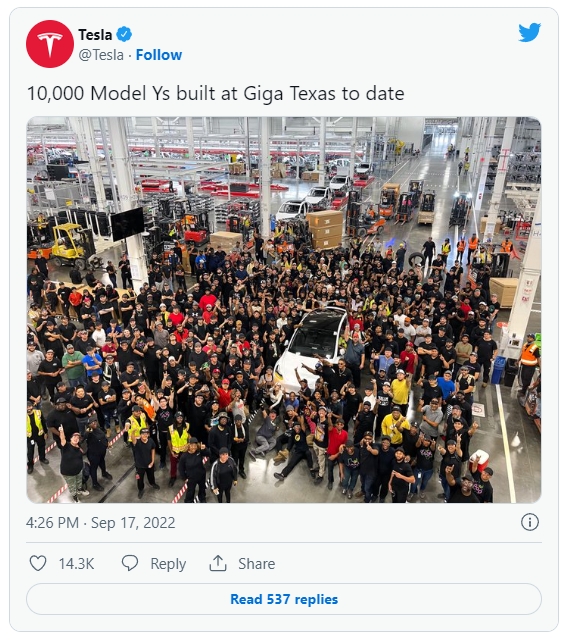이는 지난 1월부터 모델Y 생산을 시작한지 한지 8개월만의 일로 테슬라 측이 그동안 생산량을 꾸준히 늘린 결과라고 일렉트렉은 전했다.