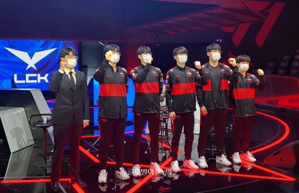 이미지 확대보기서울 종로구 그랑서울 소재 LOL 파크 e스포츠 경기장에서 오후 1시 열린 기자 회견에서 T1의 감독과 선수들은 이번 롤드컵 그룹 스테이지에서 함께 하게 된 중국의 에드워드 게이밍(EDG), 미국의 클라우드9(C9)을 높이 평가하면서도 승리에 대한 자신감을 드러냈다.