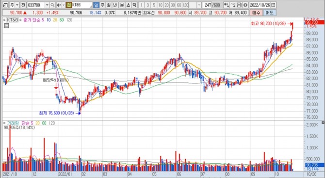 이미지 확대보기KT&G의 주가는 26일 오전 9시 10분 현재 전일보다 1300원(1.45%) 오른 9만700원에 거래되고 있습니다.