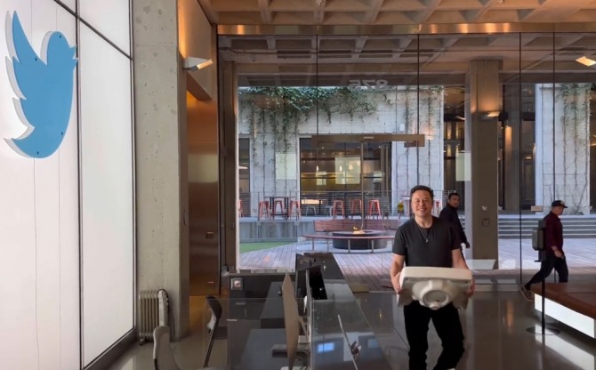 자신의 트위터 인수를 기정사실화하는 듯 머스크 CEO는 26일 마치 개선장군을 연상케 하는 모습으로 미국 샌프란시스코에 있는 트위터 본사 건물에 자신이 쓰는 세면대를 들고 나타나 언론의 이목을 끌었다.