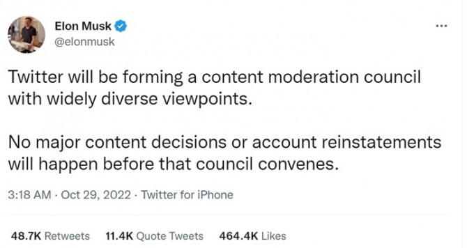 뉴욕타임스(NYT) 등 외신에 따르면 머스크 CEO는 이날 자신의 트위터 계정을 통해 "트위터는 다양한 관점을 가진 콘텐츠 관리 위원회를 구성할 것"이라고 말했다.