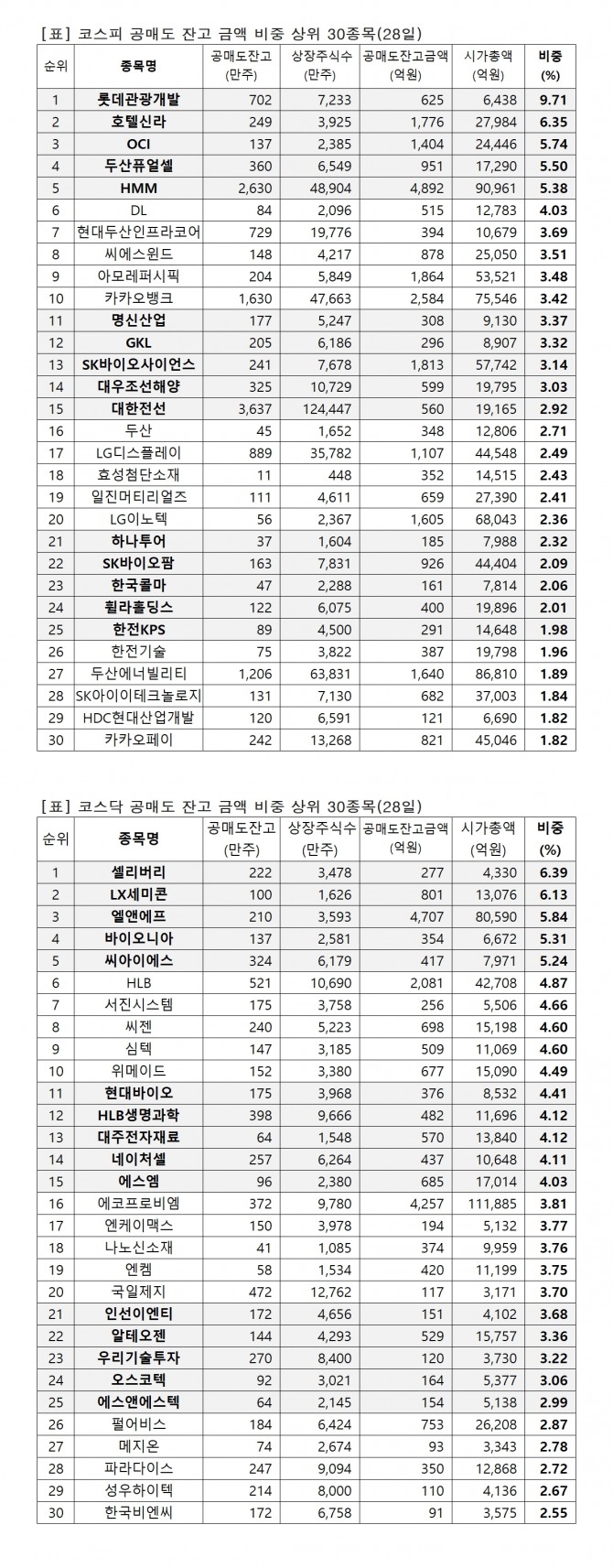 이미지 확대보기2일 한국거래소에 따르면 지난달 28일 기준 유가증권시장과 코스닥시장에서 시가총액 대비 공매도 잔고금액 비중 상위 종목은 다음과 같다.