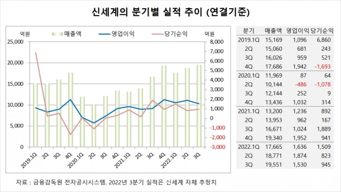신세계는 올해 3분기 실적을 잠정 집계한 결과 연결기준 매출액이 1조9551억원, 영업이익이 1530억원, 당기순이익이 945억원에 이를 것이라고 공시했습니다.