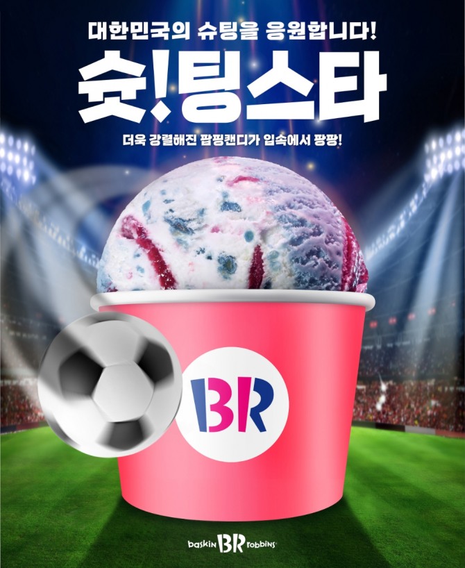 이미지 확대보기25일 배스킨라빈스는 대한민국 축구 국가대표팀의 선전을 기원하기 위해 인기 플레이버 ‘슈팅스타’를 업그레이드한 ‘슛!팅스타’를 한정 판매한다.
