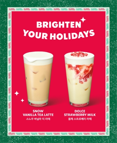 ‘스노우 바닐라 티 라떼’는 잉글리시 브렉퍼스트 티와 얼 그레이 티가 어우러진 블랙 티에 연유, 스노우 폼의 바닐라 풍미를 느낄 수 있는 음료다. 스노우 폼은 눈처럼 소복이 쌓아 올려 겨울의 감성을 표현했다.