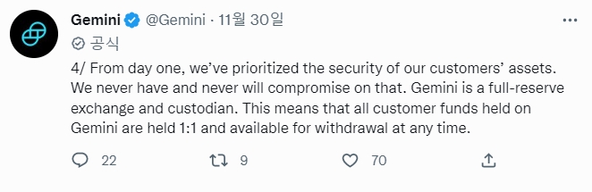 제미니는 "첫날부터 고객 자산의 보안에 우선 순위를 두었다. 우리는 결코 그것에 대해 타협하지 않았고 앞으로도 그럴 것이다. 제미니는 풀 리저브 거래소이자 관리인이다. 이는 제미니에 보유된 모든 고객펀드가 1:1로 보유돼 언제든지 인출이 가능하다는 의미다"라고 적었다.