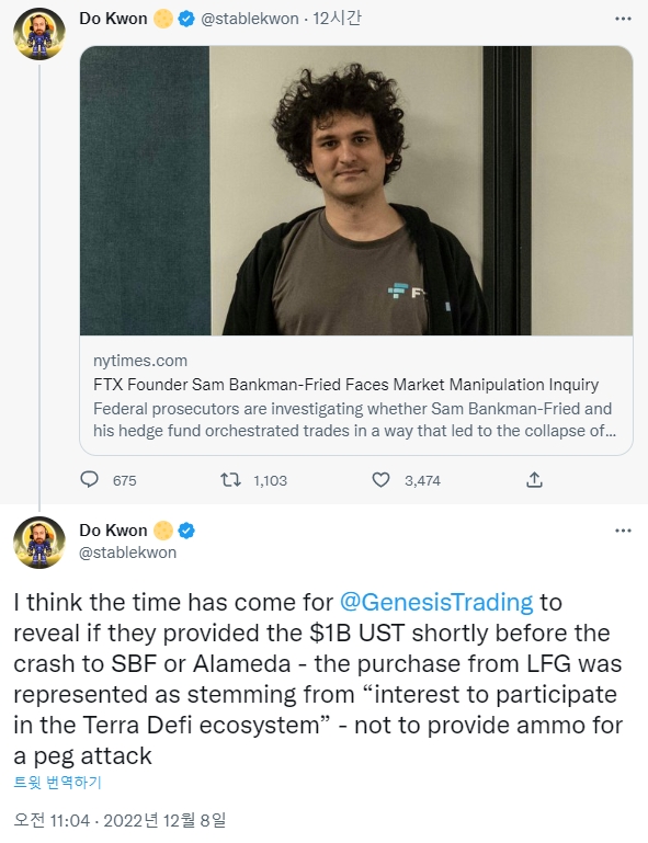 권도형은 트윗터에서 "SBF 혹은 알라메다 추락 직전에 그들이 10억달러(약 1조3200억 원) UST를 제공했는지를 제네시스 트레이딩이 밝힐 때가 온 것 같다. 그들이 LGF(루나 재단) 재단으로부터의 구매는 페그 공격을 위한 탄약을 제공하지 않기 위해 테라 디파이 생태계에 참여하려는 관심에서 비롯된 것"으로 표현했다.