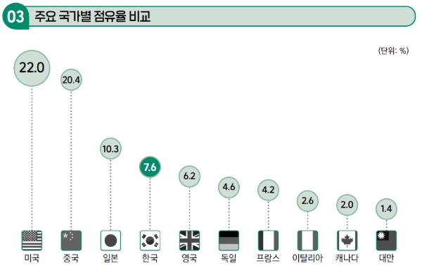 세계 전체 게임 시장 규모는 2197억달러(약 279조원)으로 2020년 대비 175억달러(약 22조원, 8.7%) 성장했다. 한국의 매출 비중은 7.6%로 미국(22%, 이하 매출 점유율)·중국(20.4%)·일본(10.3%)에 이어 4위를 기록했다. 2020년 대비 순위 변동은 없었고 점유율은 0.7%p 올랐다.