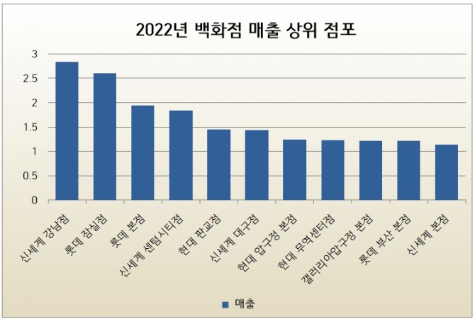 업계에 따르면 신세계 강남점과 롯데 잠실점을 포함해 1조원 매출을 넘어선 백화점은 전국 11곳입니다. 롯데는 본점과 부산본점, 신세계는 센텀시티점·대구점·본점, 현대백화점은 판교점·무역센터점·본점, 갤러리아 명품관입니다.